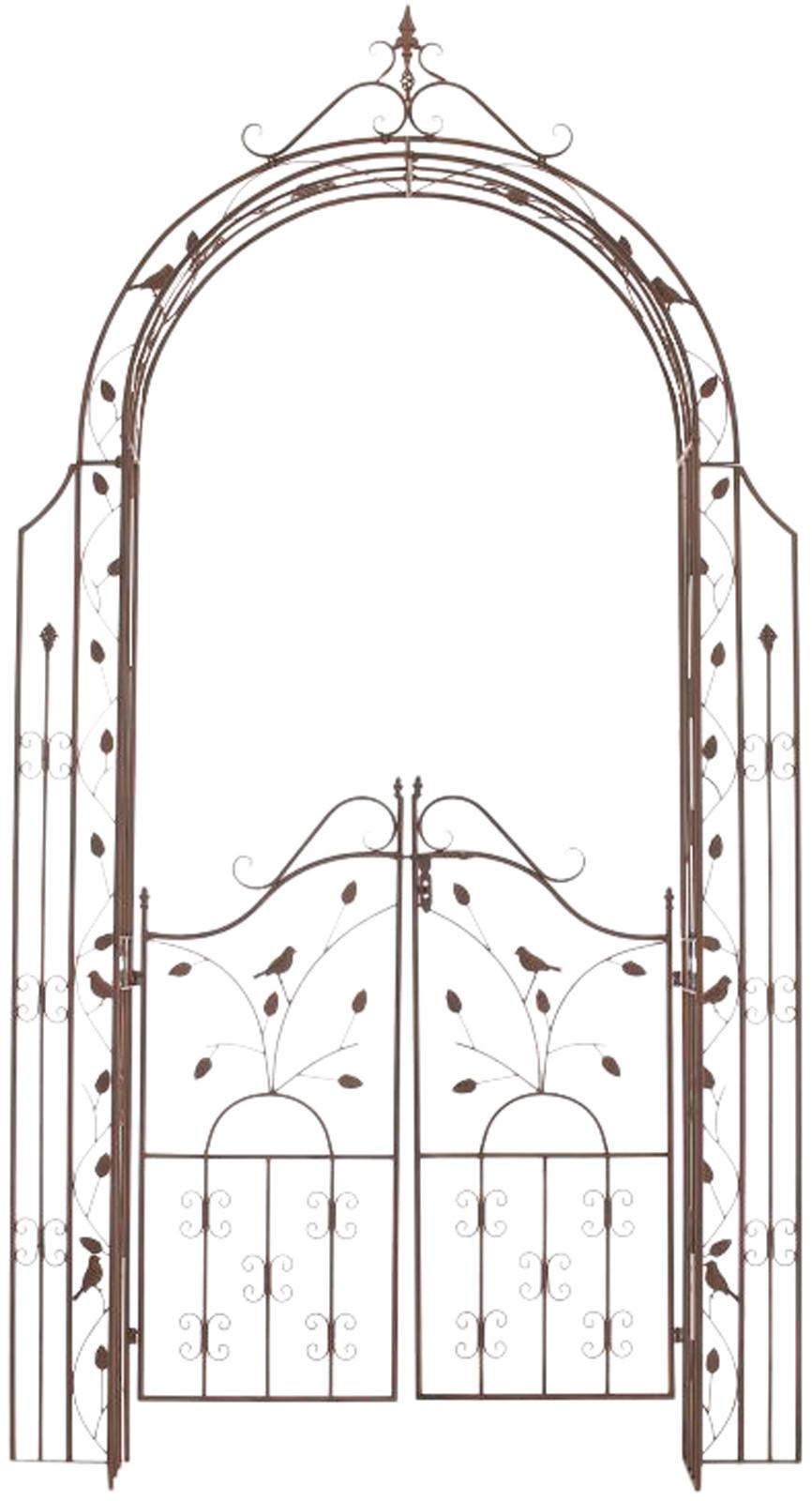 Unser exklusiver Rosenbogen Grenada mit Tor ist liebevoll mit vielen Details verziert und eignet sich daher perfekt als Rankhilfe für Efeu und andere Kletterpflanzen. Aber auch freistehend ist dieser Rosenbogen mit den beiden verschließbaren und wunderschön verzierten Torflügeln ein Blickfang in jedem Garten.