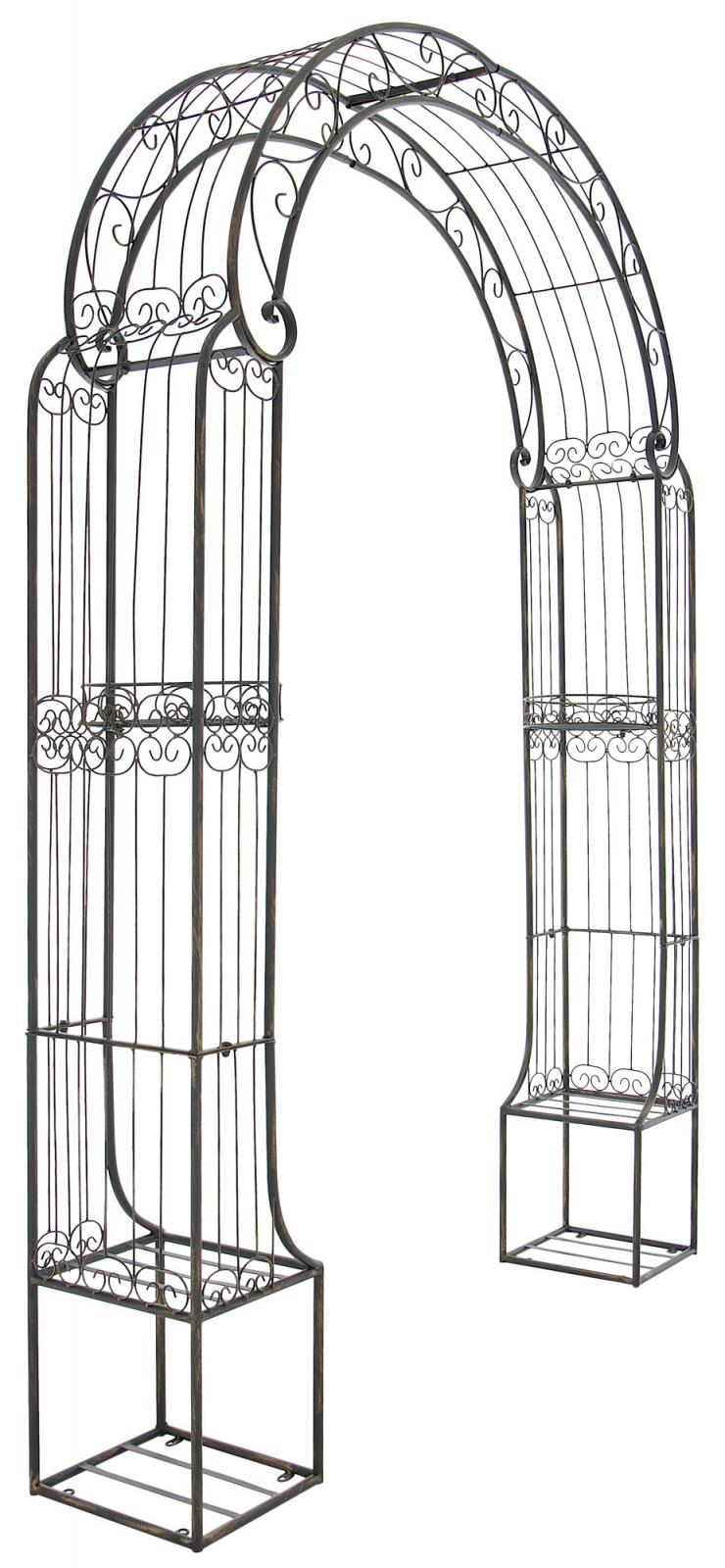Exklusiver Rosenbogen aus pulverbeschichtetem Eisen. Dieser Bogen hat ein elegantes Design und ist die ideale Rankhilfe für alle Rankpflanzen, wie z.B. Rosen oder Efeu. Er besticht nicht nur durch sein elegantes Design, sondern besitzt auch noch insgesamt vier Abstellmöglichkeiten z.B. für weitere Pflanzen oder andere schöne Dekoideen. Zur Befestigung dienen insgesamt acht vorgefertigte Löcher im Fuß des Rosenbogen. Hiermit kann der Rosenbogen leicht und schnell am Boden standsicher fixiert werden.