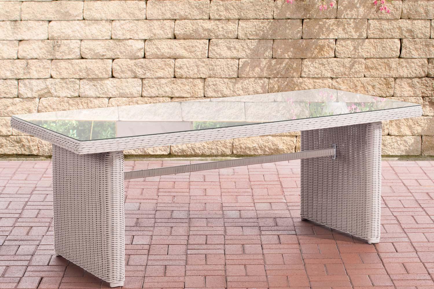 Die kunstvoll geflochtene und auch am hohen Rand aufwendig gearbeitete Tischplatte bietet viel Platz für Kulinarisches. Dazu ist sie pflegeleicht mit einer seitlich etwas abgerundeten Glasauflage ausgestattet, die auch sehr edel aussieht. Sie wird von transparenten Gumminoppen rutschsicher getragen und liegt dadurch nicht direkt auf dem Geflecht. Auch unter dem Tisch ist viel Platz, da jeweils zwei zusammengeflochtene Tischbeine nicht nur für hohe Stabilität, sondern auch für angenehme Beinfreiheit sorgen.