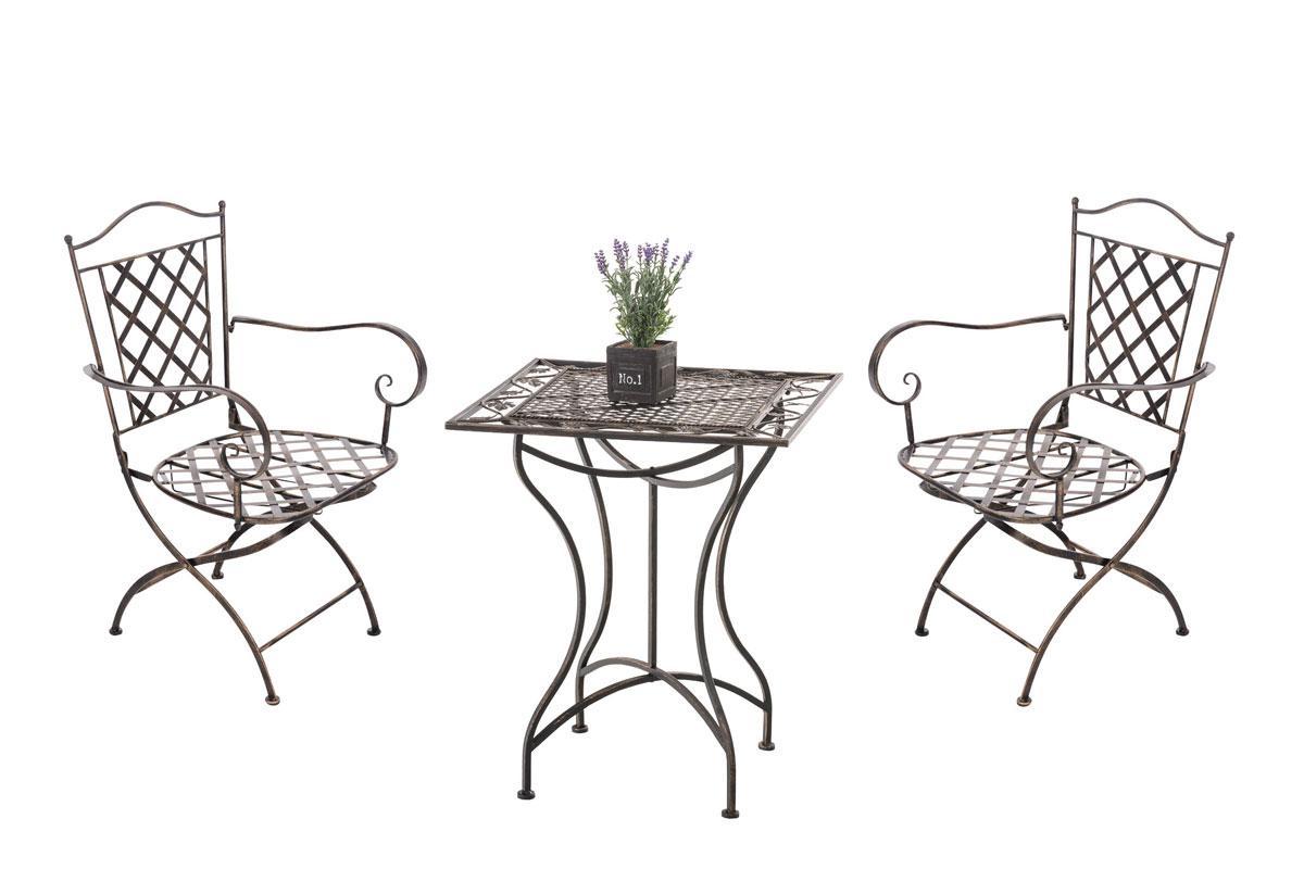 Diese wunderschöne Sitzgruppe in nostalgischem Design ist ein echter Hingucker auf jeder Terrasse und in jedem Garten. Sie beeindruckt in ihrer grazilen Form, wie auch in den liebevoll handgefertigten Details der Verzierungen. Sie eignet sich perfekt um Ihrer Gartengestaltung eine besondere Note zu geben und ist wie geschaffen Ihren lauschigen Lieblingsplatz im Garten mit ihrem Charme aus längst vergangenen Zeiten zu verschönern.Das Produkt wurde aus Eisen handgefertigt und ist daher extrem stabil. Die Oberfläche ist mit in Handarbeit nachempfundener antiker Patina veredelt. Dieses edle Designstück ist absolut neu und gleichzeitig eine perfekte Reproduktion in historischem Stil. Das Produkt ist original verpackt und leicht aufzubauen.