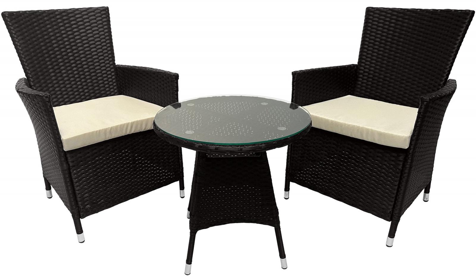 3-teiliges Gartenmöbel-Set aus wetterfestem PE-Rattan ideal für Balkon, Terrasse oder Garten. Das Set besteht aus zwei komfortablen Stühlen und einem eleganten Couchtisch mit weißer Sicherheitsglasplatte (5 mm). Der stabile Stahlrahmen sorgt für Langlebigkeit und sicheren Stand. Die 5 cm dicken Hochdichte-Sitzkissen bieten hohen Sitzkomfort und sind mit abziehbaren, waschbaren Bezügen aus 180 g/m² Polyester ausgestattet pflegeleicht und strapazierfähig