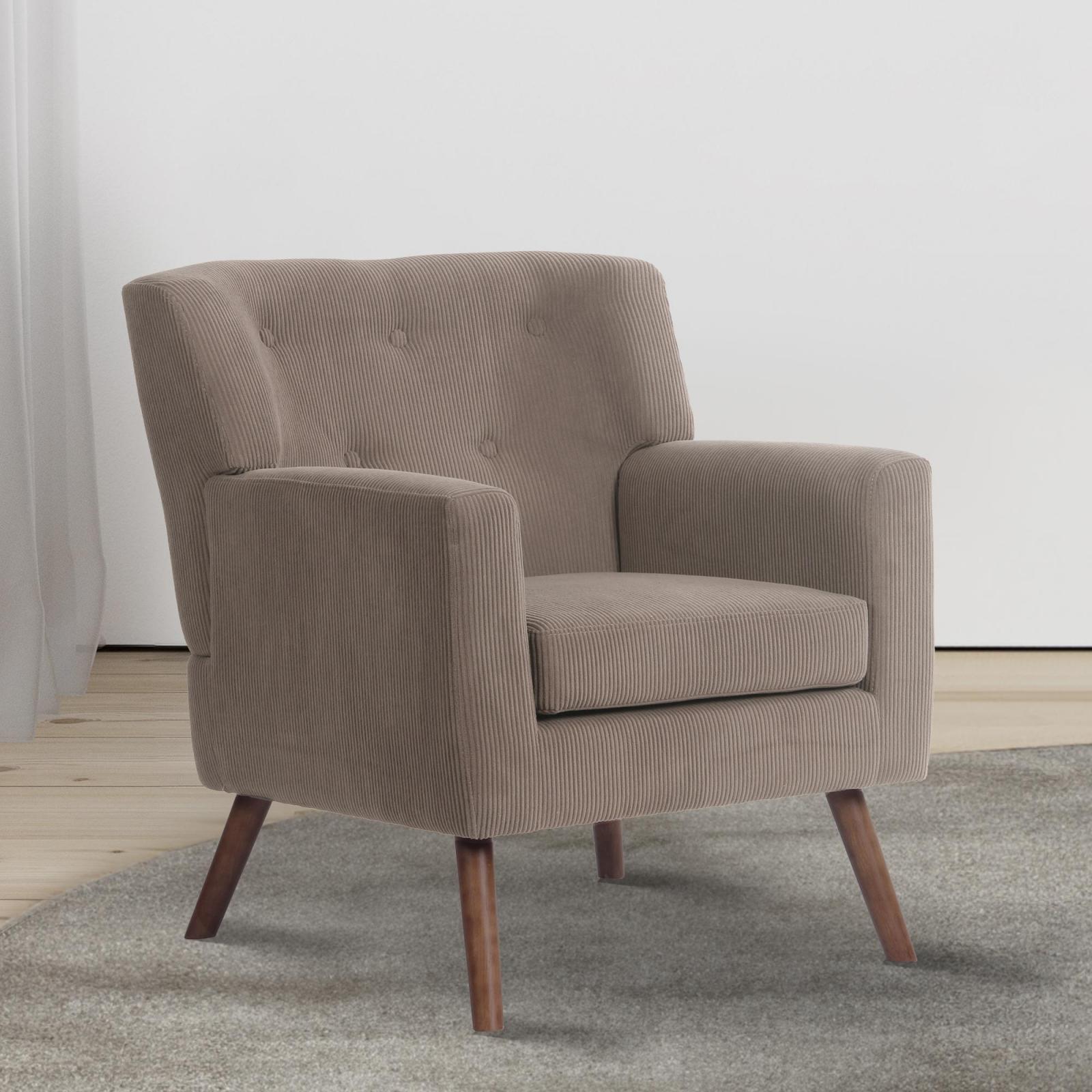 Der großzügige Polstersessel überzeugt mit einem strapazierfähigen und schicken Cordbezug in modischen Farben sowie mit stabilen Beinen aus Kautschukholz. Die Rückenlehne steigert den Sitzkomfort zusammen mit der dicken Polsterung erheblich.
