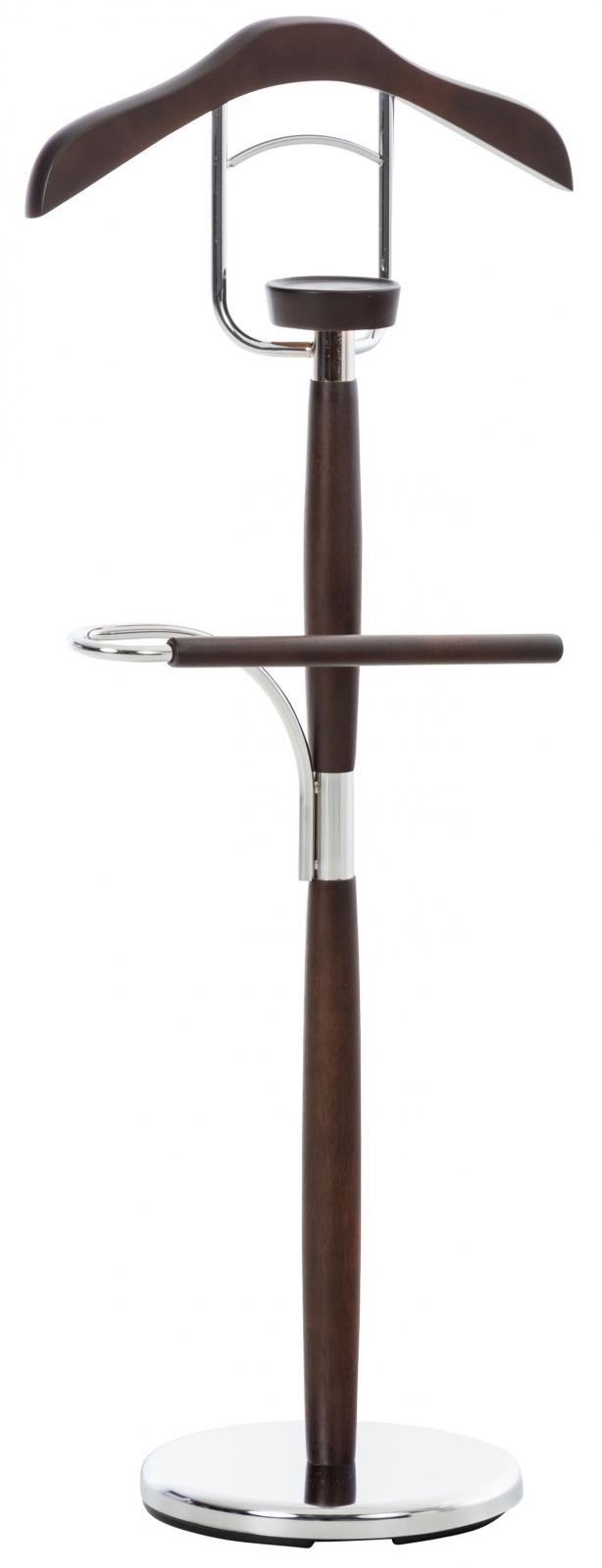 Dieser unisex Herrendiener macht immer eine gute Figur und passt in jedes Ankleide-, Schlaf- und Gästezimmer. Der Kleiderständer ist aus Metall in Chromoptik gefertigt und in verschiedenen Holzfarben erhältlich. Platzsparend und praktisch kann man hier seine Kleidung für den Tag vorbereiten. Der schwere Fuß sorgt für eine gute Standhaftigkeit. Durch den integrierten Kleiderbügel sowie eine Hosenstange lässt sich die Garderobe faltenfrei aufbewahren. Auf der praktischen Ablagefläche können Manschettenknöpfe, Schmuck oder Ähnliches abgelegt werden.