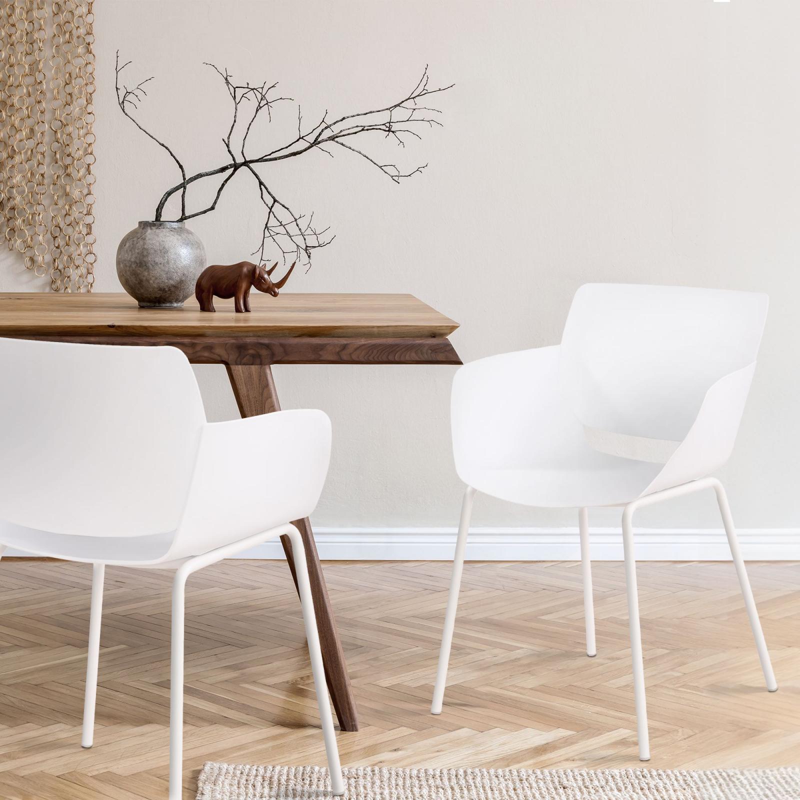 Das Stuhlgestell ist aus pulverbeschichtetem Stahl gefertigt, sodass es korrosionsbeständig ist und nicht rostet. Die Farben von Sitzschale und Stuhlgestellen sind aufeinander abgestimmt.